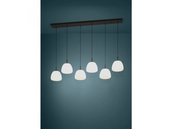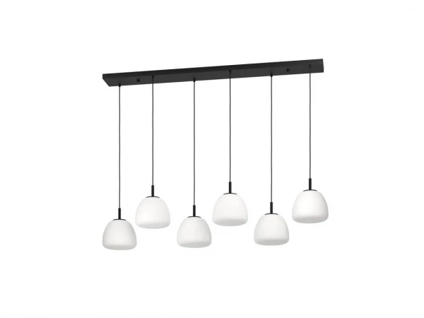 Eglo Balmes is een moderne plafondlamp, bestaande uit opaal-mat wit glas. De 6 glazen bollen die op de zwarte metalen plafondplaat zijn bevestigd, bieden een leuke ritmiek door de twee verschillende hoogtes die worden gebruikt. Ideale verlichting om boven een mooie rechthoekige eettafel te hangen in een modern of hedendaags interieur.
