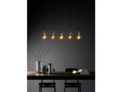 5 lichtbronnen voor de prijs van 1? Dit is de lamp die iedereen boven zijn eettafel wilt. Met de Gelka hanglamp heb je meer dan dubbel genot van een lekker maaltijd of een glas wijn met vrienden. De lichtbronnen zitten elk vervat in een glazen armatuur. De gedraaide kabels waaraan ze zijn opgehangen, geven een extra touch aan het geheel. Pas de hoogte aan naar wens, tot maximaal 163 centimeter. Of doe eens iets anders en installeer Gelka boven een commode voor een verrassend effect. Aangesloten op een dimmer speel je probleemloos met de kracht van deze lichtbronnen.
