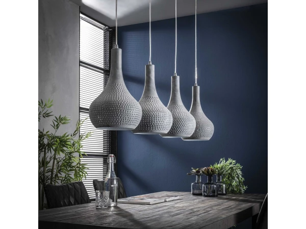 Deze 4-lichts hanglamp, inclusief de plafondbevestiging, is uitgevoerd in grijs of zwart/bruin metaal. De kegelvormige lampenkappen zijn volledig handmatig geperforeerd, waardoor elke lamp uniek is. De gaatjes maken het model semi-transparant, waardoor het licht sfeervol wordt doorgelaten. De lamp is verder voorzien van kabels van textiel. Gezien de afmeting van deze lamp, past hij perfect boven een middelgrote eetkamertafel.