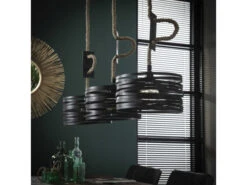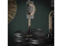 Deze trendy hanglamp heeft drie getwist metalen kappen. De stroomkabels zijn afgewerkt met touw en de kappen zijn afgewerkt in slate grey met een touch of brown. Deze combinatie geeft de lamp een speelse, eigentijdse uitstraling. Iedere kap is afzonderlijk in hoogte verstelbaar tot 150 cm. Er wordt aanbevolen een LED lichtbron te gebruiken. Deze hanglamp maakt deel uit van een serie bestaande uit een tafellamp, een vloerlamp en een hanglamp.