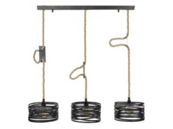 Deze trendy hanglamp heeft drie getwist metalen kappen. De stroomkabels zijn afgewerkt met touw en de kappen zijn afgewerkt in slate grey met een touch of brown. Deze combinatie geeft de lamp een speelse, eigentijdse uitstraling. Iedere kap is afzonderlijk in hoogte verstelbaar tot 150 cm. Er wordt aanbevolen een LED lichtbron te gebruiken. Deze hanglamp maakt deel uit van een serie bestaande uit een tafellamp, een vloerlamp en een hanglamp.