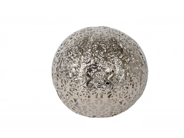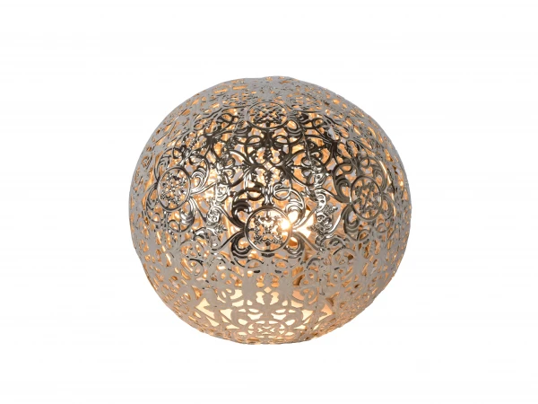 Deze elegante tafellamp blinkt uit dankzij een fijne structuur gemaakt van metaal. De ronde bol is omgeven door een maas van sierlijke krullen en motieven. Die zorgen voor een zeer luxueuze aanblik. De tafellamp is perfect als extra sfeerverlichting in je woonkamer, in een nis van de wandkast of als decoratie-element in je slaapkamer. Paolo, zo heet de tafellamp, bedien je makkelijk dankzij de schakelaar op het snoer. In een klassiek of landelijk interieur staat deze tafellamp erg mooi, maar ook in moderne woningen voelt de tafellamp zich perfect thuis.