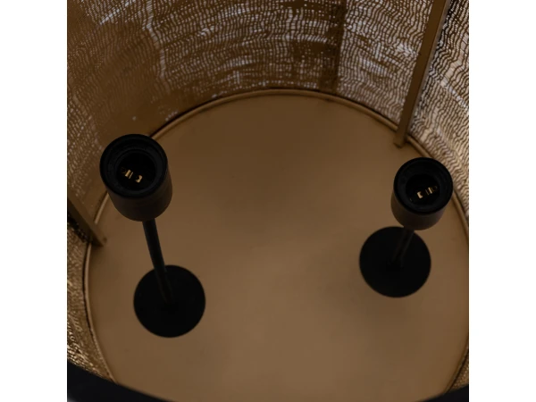 Vloerlamp Jarne van het merk PTMD vormt een sfeervolle aanwezigheid in jouw woonkamer. De lampenkap in cilindervorm zorgt samen met de voet in zwart metaal voor een leuke twist. De binnenkant heeft een gouden finish en beschikt over twee voetjes om lichtbronnen in te plaatsen. Kom jij ook eens langs om deze sfeerbrenger in het echt te bewonderen?